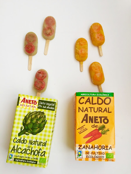 Yo he preparado una #noreceta, tan solo he rellenado mis moldes para polos con los caldos para tomarlos como entrantes de una manera divertida; Les he añadido unos "tropezones", en los de zanahoria unas rodajas de zanahoria que escaldé previamente unos segundos, y para los de alcachofa, corte una rodajas de tomates cherry (que estén fuertes) un poco de sal y vuelta / vuelta en la sartén. Lo dicho una #noreceta de lo mas sencilla.