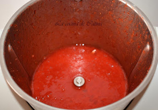 Ponemos las fresas en una batidora junto con el azúcar y el chorrito de limón y trituramos todo hasta dejarlo echo puré.