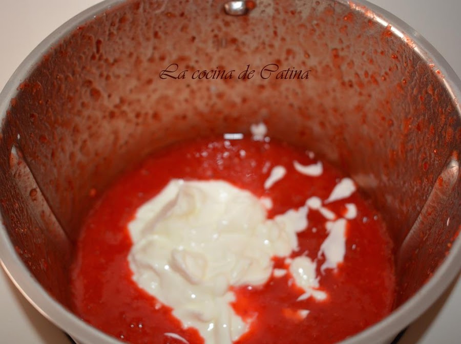 Añadimos los yogures griegos, batimos unos segundos hasta que se mezcle todo bien y lo repartimos en los moldes.