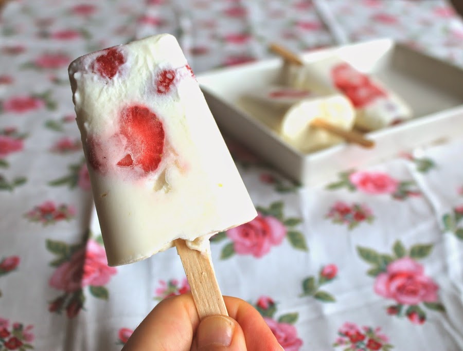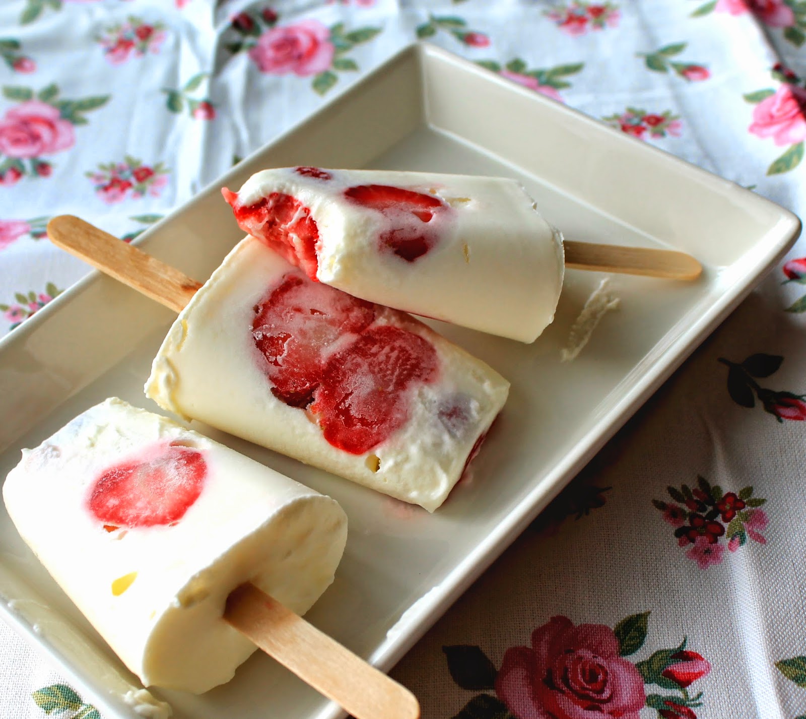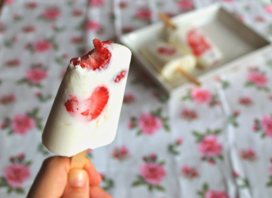 Con este último punto recién descubierto, me he lanzado a hacer helados como una loca (y a comerlos). Estos polos de hoy son una muestra. Son muy fáciles de hacer y están buenísimos. Tienen todo lo bueno de las fresas con nata (crema de leche), y además está muy fresquitos.