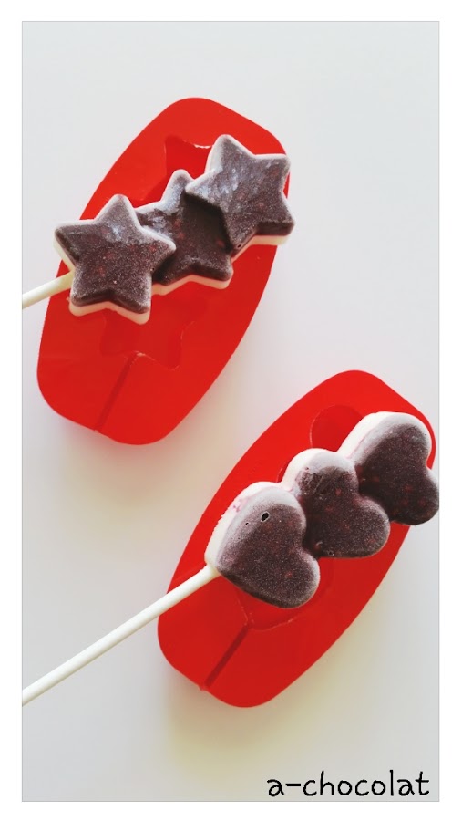 Preparamos los polos, con una cucharilla de postre echamos primero una capa de puré de moras, ponemos el palito del helado, y echamos otra capa con la crema de cheesecake de lima. Lo dejamos en el congelador la noche entera. Al día siguiente, desmoldamos cómodamente, y nos los comemos!!