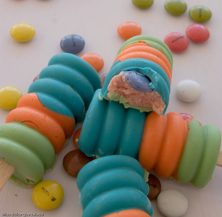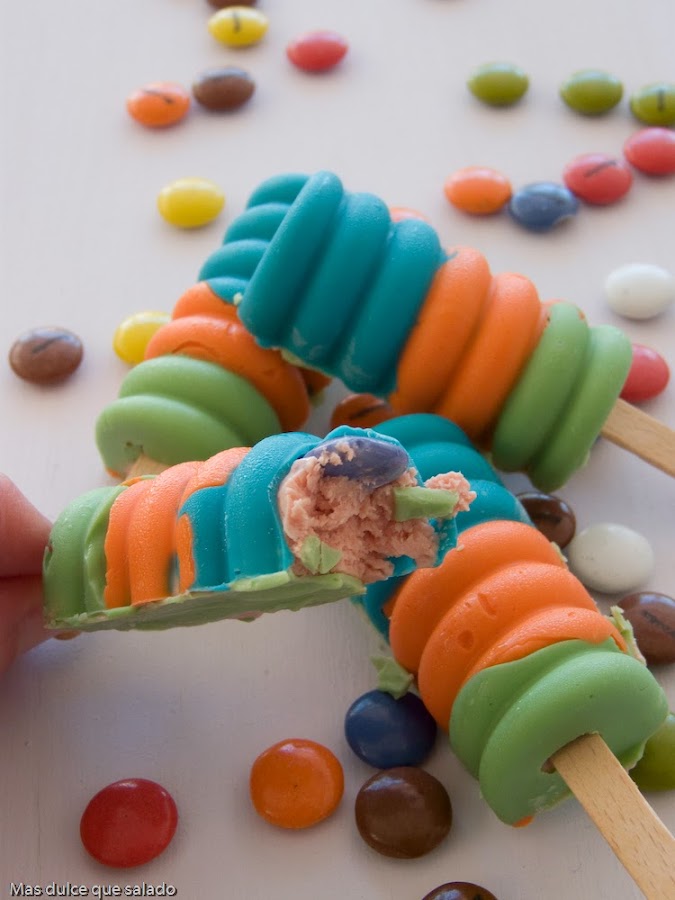 Sacamos el molde y colocamos los palos para el helado. Rellenamos con el helado sin que llegue hasta el borde. Introducimos en el congelador 1 hora para que se endurezca el helado. Sacamos y cubrimos con más chocolate, este lo podéis colorear o dejarlo blanco, lo suyo es darle un toque de color para que quede más vistoso. Al estar el helado congelado, el chocolate se va a endurecer nada más entrar en contacto con él. Guardamos en el congelador hasta el momento de servir.