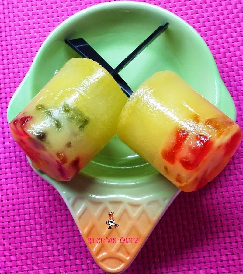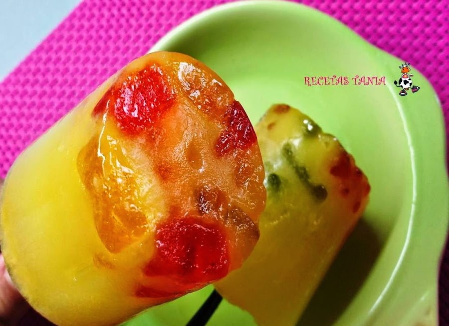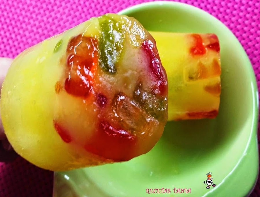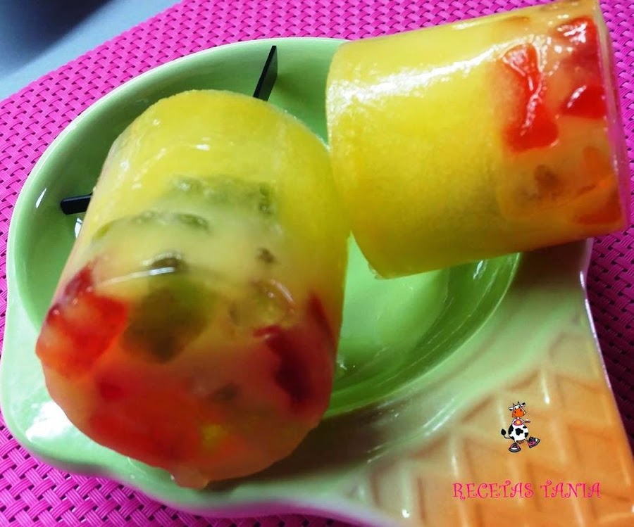 Ponemos unos cuantos ositos en los vasos o moldes que vayamos a usar para hacer los polos... rellenamos de zumo de naranja (o cualquier otro sabor) Metemos un palo o cuchara dentro y al congelador. Cuando esté totalmente congelados con cuidado desmoldamos y a disfrutar de nuestro rico polo.