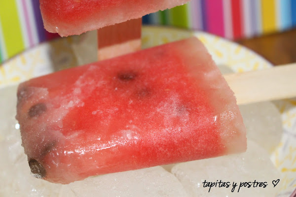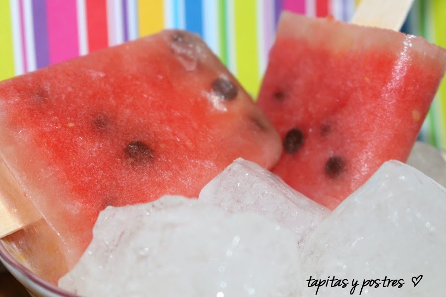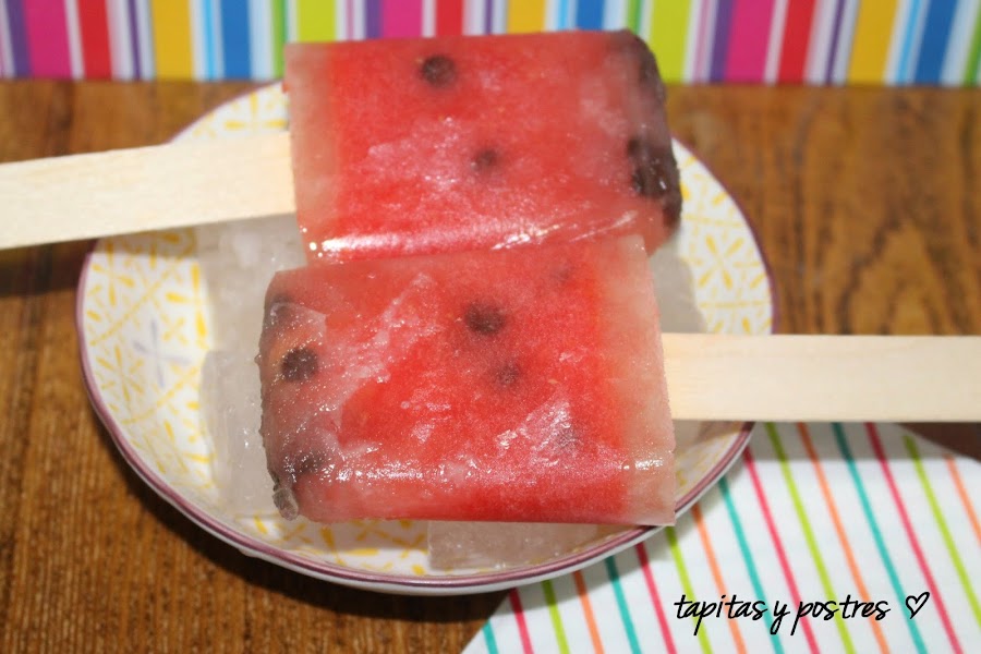 Estos polos son super fáciles, son de sandía y llevan unas pepitas de chocolate para que simulen las pepitas de la sandía. Se hace en varios pasos, ya que hay que esperar que congele un poco, pero nada complicado.