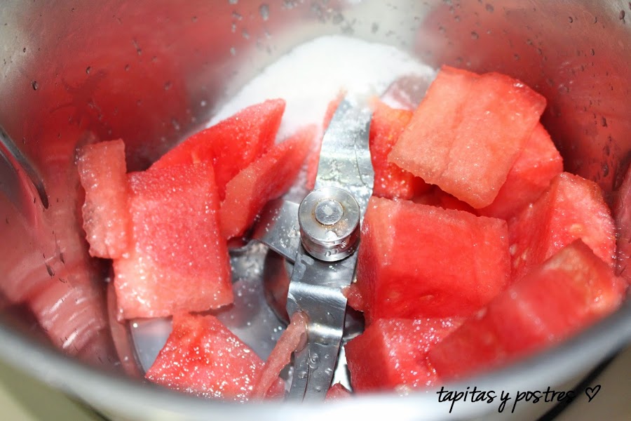 Trituramos la sandía, echais azúcar al gusto, yo he puesto una cucharada.
