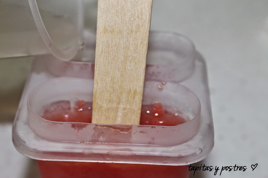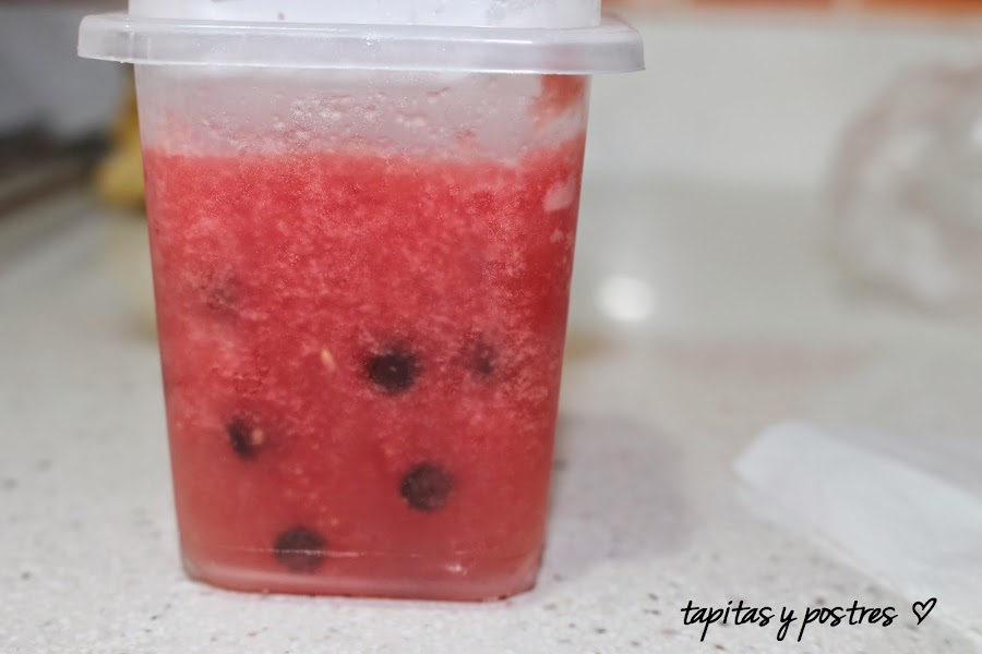 trituramos la sandía, con el azúcar y el limón para que no se oxide y echamos en los moldes de polos sin llegar hasta el final. Llevamos al congelador una hora y media.