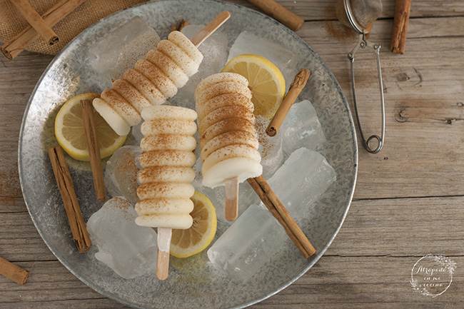 Montamos la nata (crema de leche) con unas varillas eléctricas, y añadimos el azúcar glass en el último momento. Incorporamos entonces a la leche, con movimientos envolventes hasta integrar bien. Repartimos la mezcla en los moldes para polos y congelamos durante unas horas, Desmoldamos a la hora de servir. Servimos espolvoreados con canela molida.