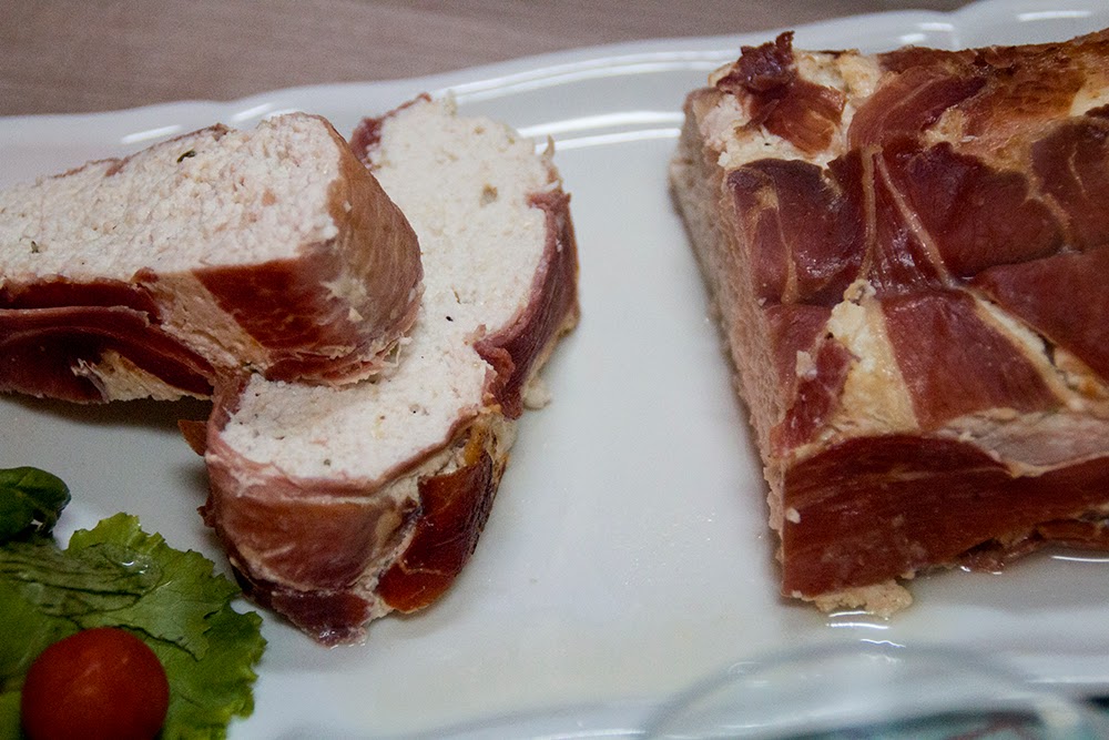 Ponemos las lonchas estiradas sobre un papel encerado, solapando ligeramente una con otra y colocamos encima la mezcla de queso y pollo. Envolvemos esa mezcla con las lonchas y le damos una apariencia de pastel alargado.