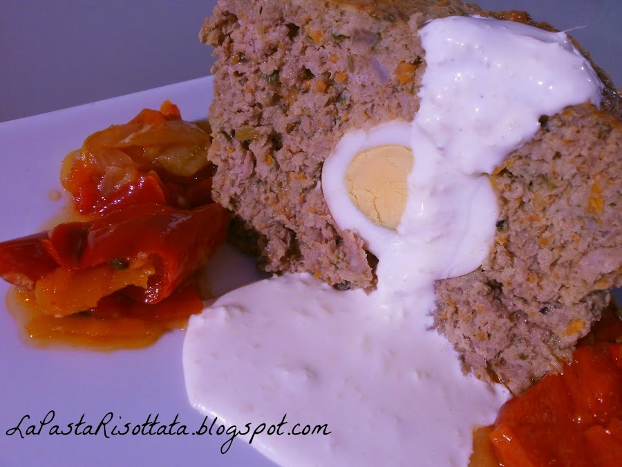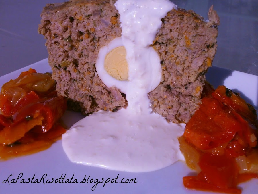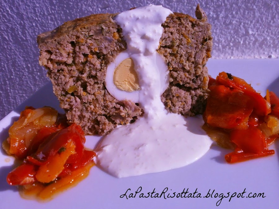 E allora gli dedicheró questo post di oggi e questa ricetta. Cosa c"é di piú rassicurante di un polpettone? Ma la vita ha anche bisogno di pizzicore;ed ecco lo zenzero! E cosa dire dell"uovo che racchiude la vita?! E diamogli pure un pó di colore con una bella peperonata! ^_^