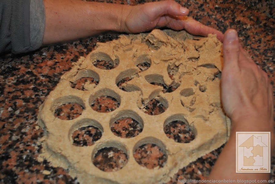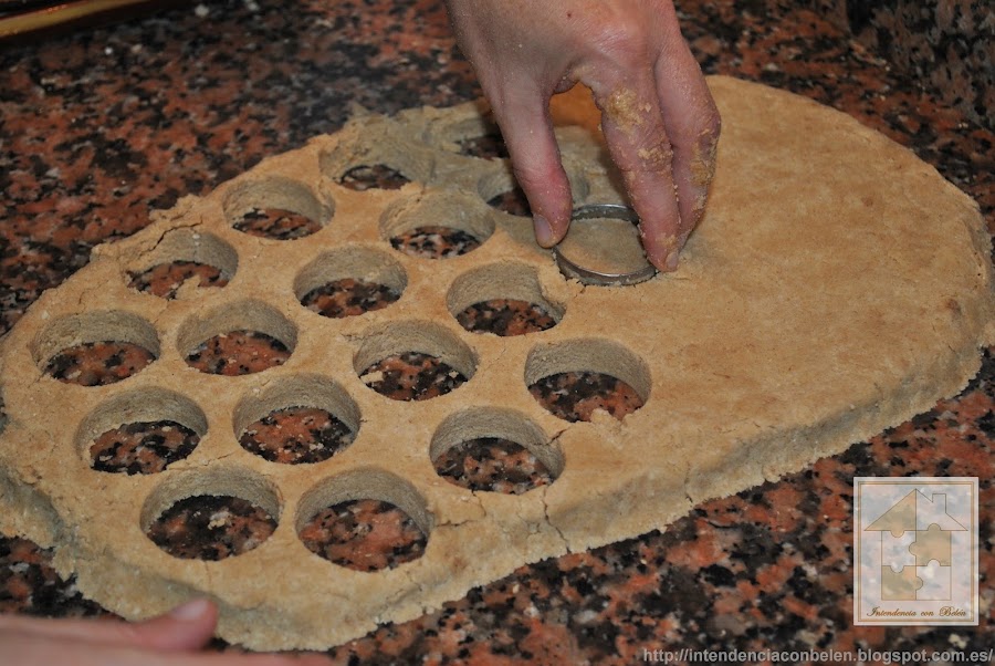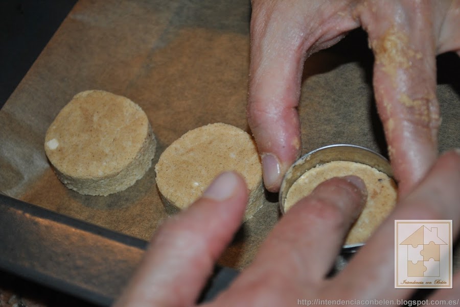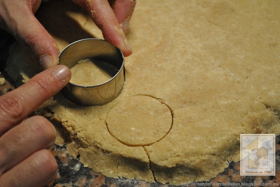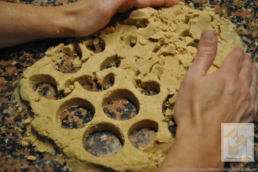 Podéis ayudaros de un rodillo, pero en ésta masa, vuestras manos serán las mejores aliadas. El grosor de la plancha determinará el tamaño del polvorón. La masa no crece, por lo que quedarán exactamente igual a como los hagáis. Si tenéis un cortador de pastas es el momento de sacarlo del cajón, si no, una tapadera o cualquier otro instrumento que tengáis a manos os ayudarán en la labor de cortar los polvorones.