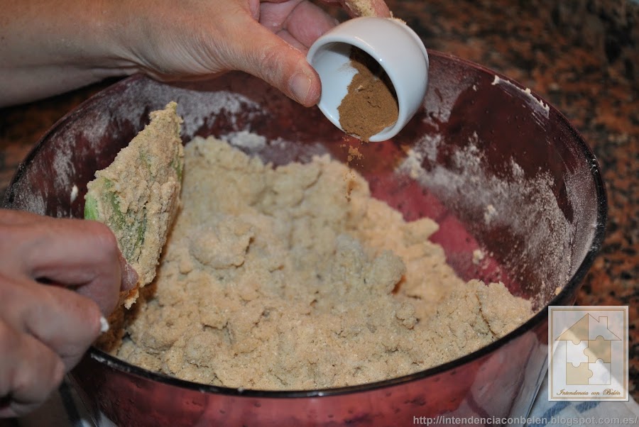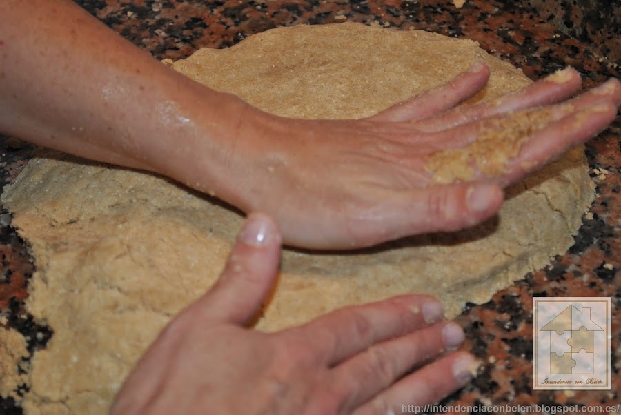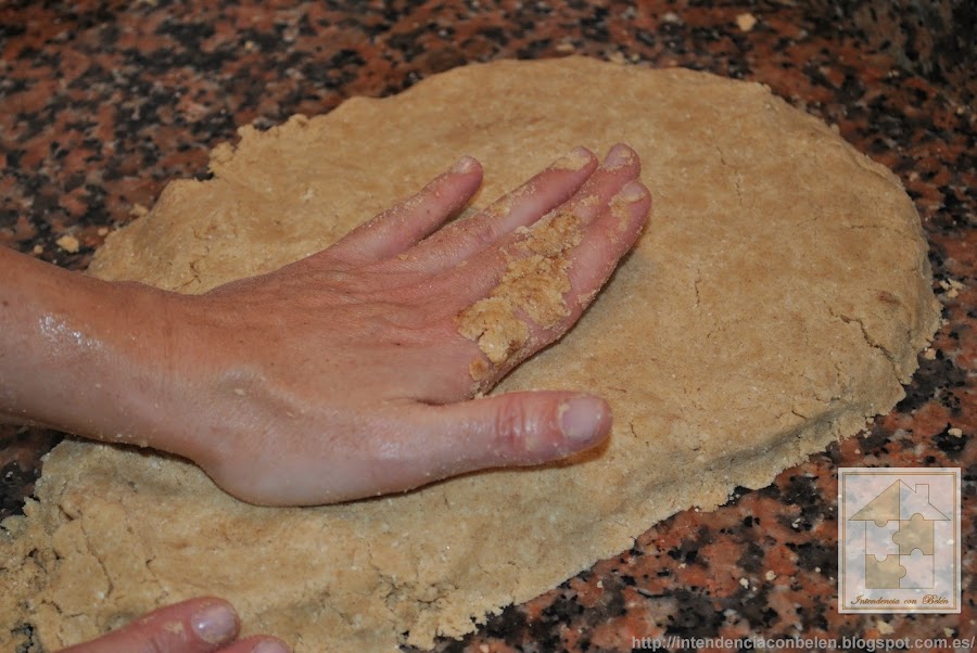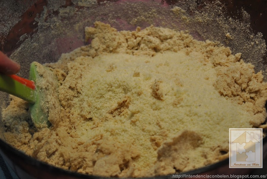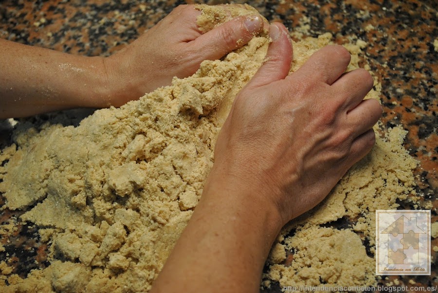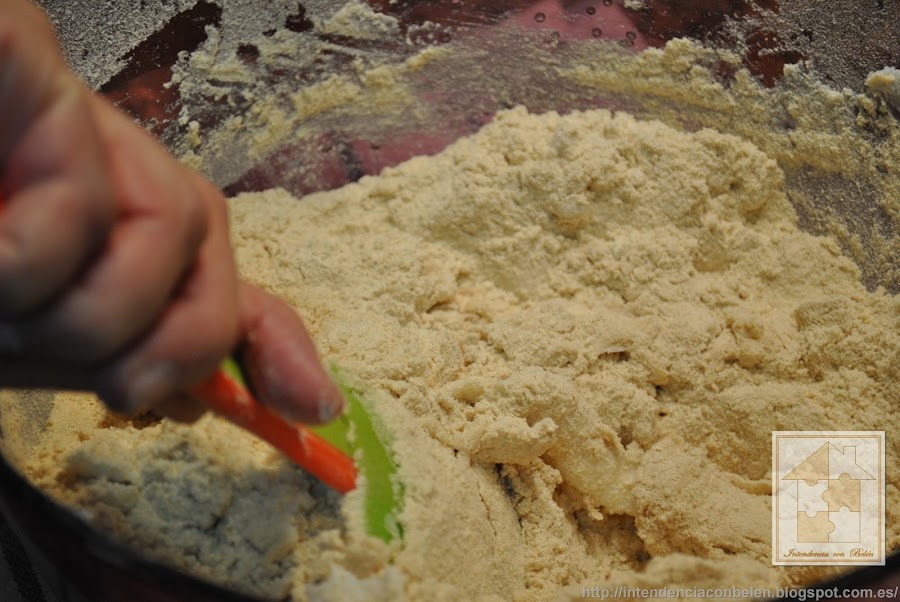 Ahora solo queda integrar bien los ingredientes. Y una recomendación, NO HAY QUE AMASAR, SOLO HAY QUE APELMAZAR E INCORPORAR. No os desesperéis, parece que se desarma, pero con paciencia, iréis consiguiendo una masa compacta.