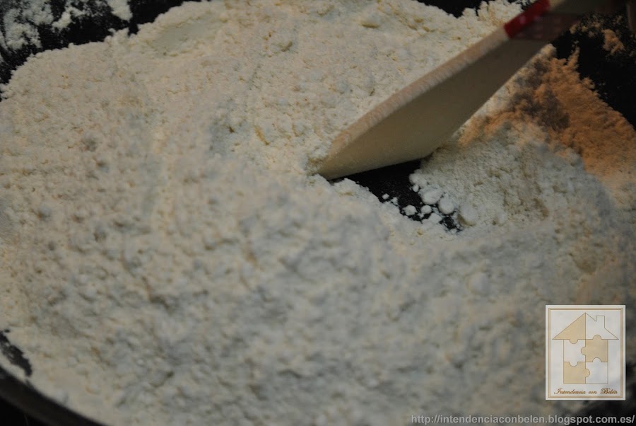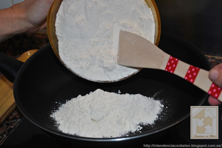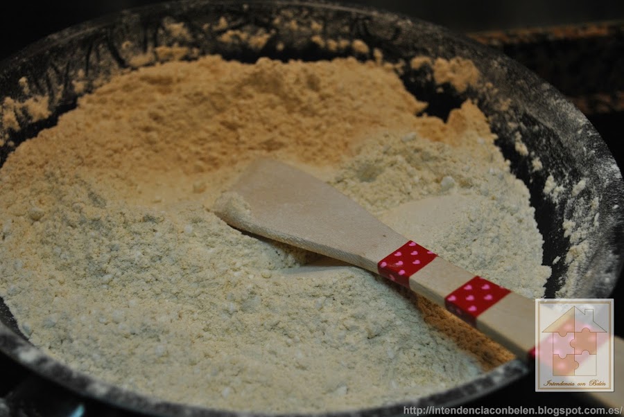 Lo primero que hay que hacer es tostar la harina. Podéis tostarla sin problema en el horno, pero tendréis que vigilarla porque se quema con facilidad. Yo en ésta ocasión he utilizado una sartén, que aunque es más lento, no se me pasa y queda perfecta. Estará en el punto justo cuando veáis que cambia de color y se hacen grumos más o menos gordos.