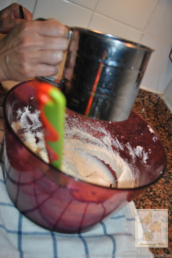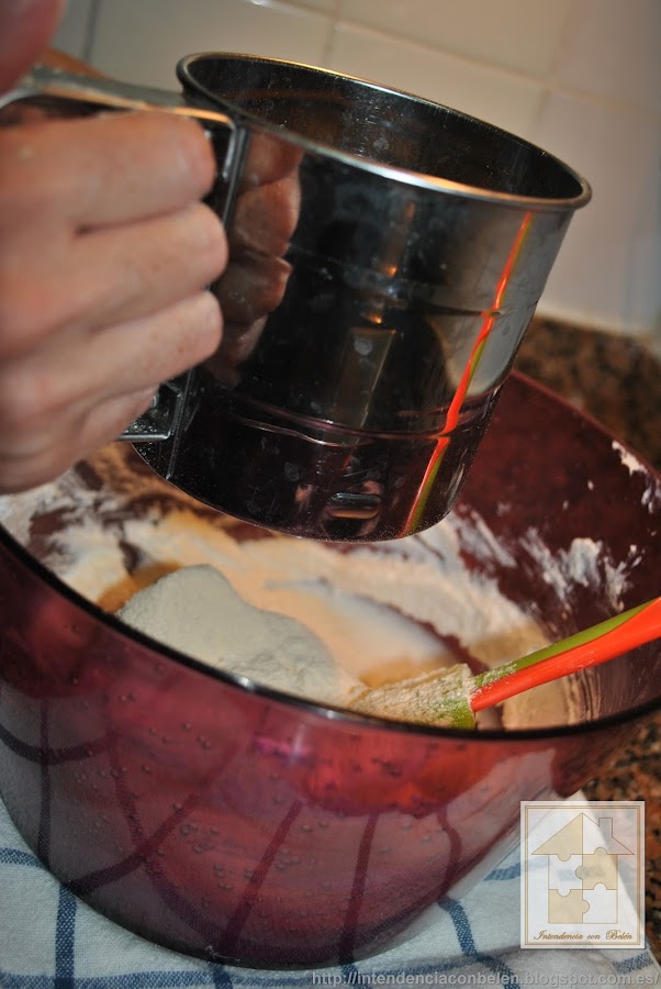 Añadimos la harina tamizada, ya que al enfriarse habrán salido aún más grumos y no podemos incorporarla de ésta forma a nuestra preparación.
