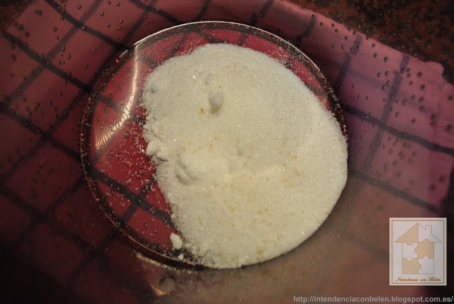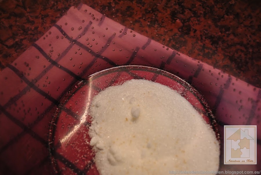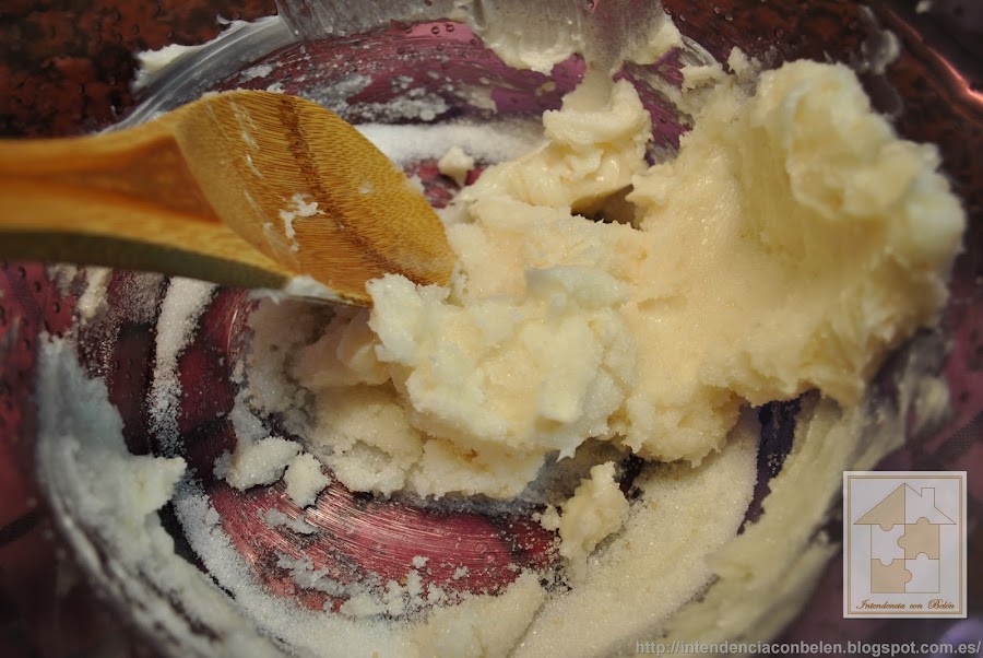 En un bol ponemos el azúcar y la manteca de cerdo que estará a temperatura ambiente. Si la añadís fría, será muy difícil de manejar. Removemos hasta que el azúcar esté totalmente disuelta.