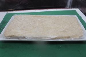 Alisamos la masa con la ayuda del rodillo, para evitar que la masa se pegue al rodillo, podemos ayudarnos poniéndole un poco de aceite o harina a este, dándole a la masa el grosor de aproximadamente un dedo.