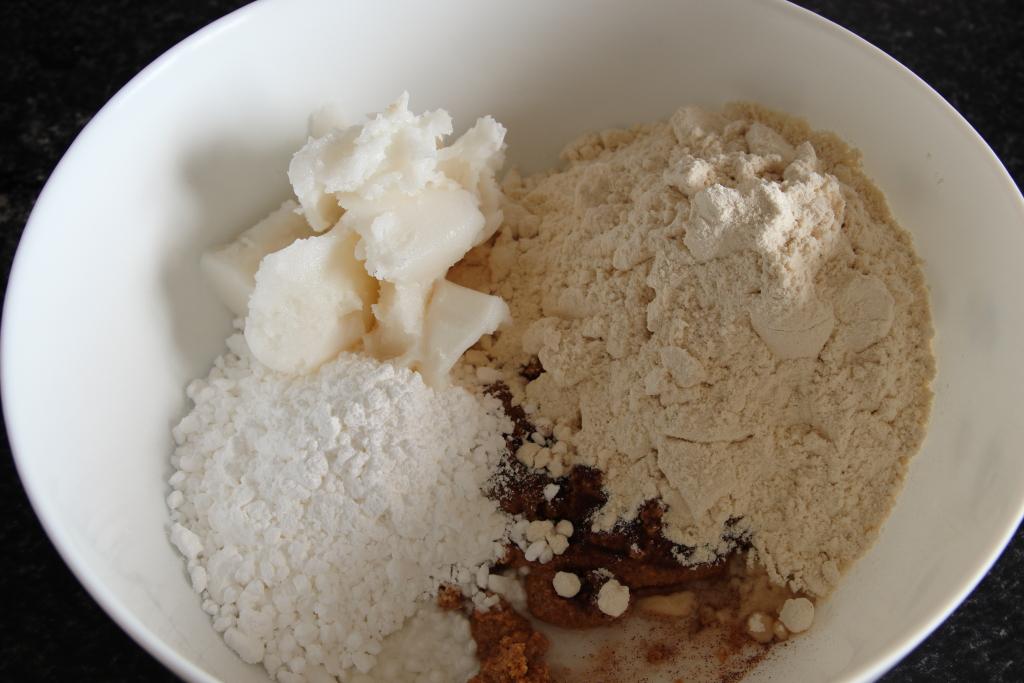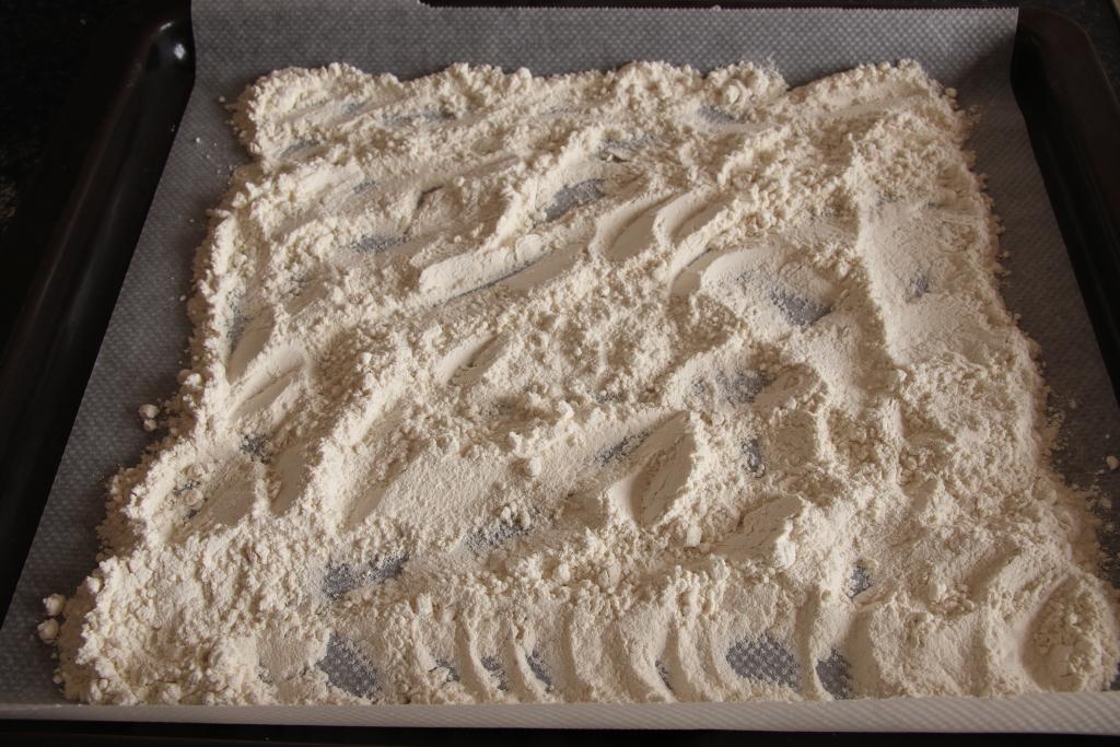Precalentamos el horno a 130ºC, calor arriba y abajo. Forramos una bandeja de horno con papel de hornear, extendemos la harina y horneamos durante 30 minutos. Sacamos y dejamos atemperar.