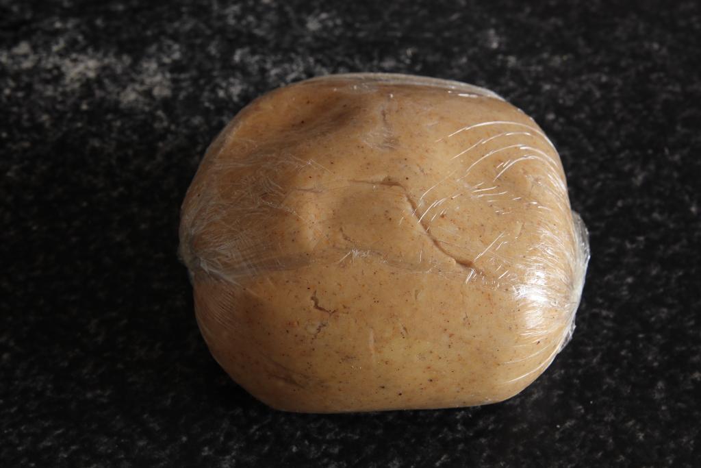 Colocamos las avellanas en la picadora y trituramos hasta que queden reducidas a polvo. En un bol mezclamos las avellanas, la harina tostada, agregamos el azúcar glas, la canela, el anís y la manteca de cerdo. Amasamos primero con una espátula para mezclar los ingredientes y después con la mano, quedará una masa arenosa y nada pegajosa. Envolvemos la masa en film transparente y dejamos en el frigorífico durante 30 minutos.