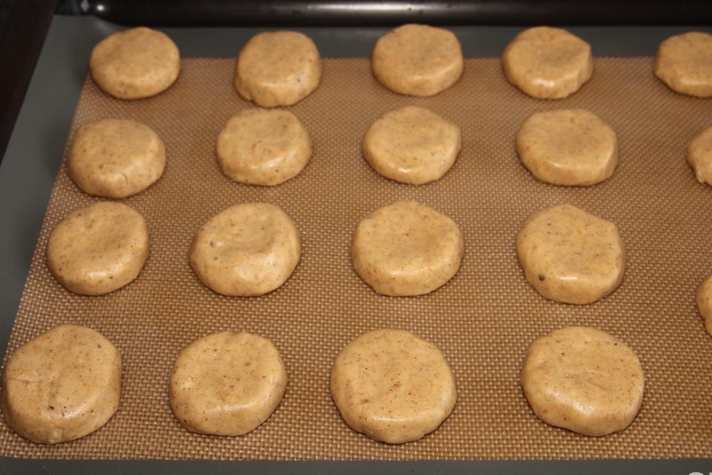 Forramos la bandeja de horno con papel de hornear o con una lámina de silicona para éstos menesteres. Cogemos pequeñas porciones de masa, damos forma , en éste caso redonda y un poco fruesa, como de 1 centímetro y las repartimos en la bandeja de horno forrada. No es necesario que queden muy separados porque no aumentan de tamaño.