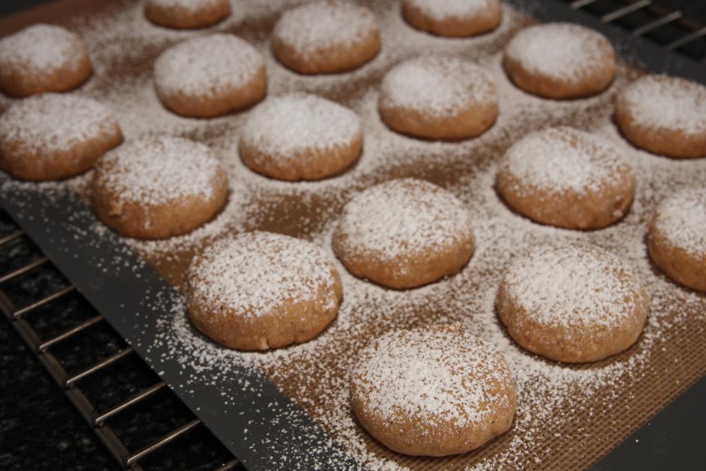 Retiramos del horno, dejamos templar y espolvoreamos con azúcar glas. Los podemos colocar en una fuente para servir o envolverlos en papel de seda de uso alimentario.