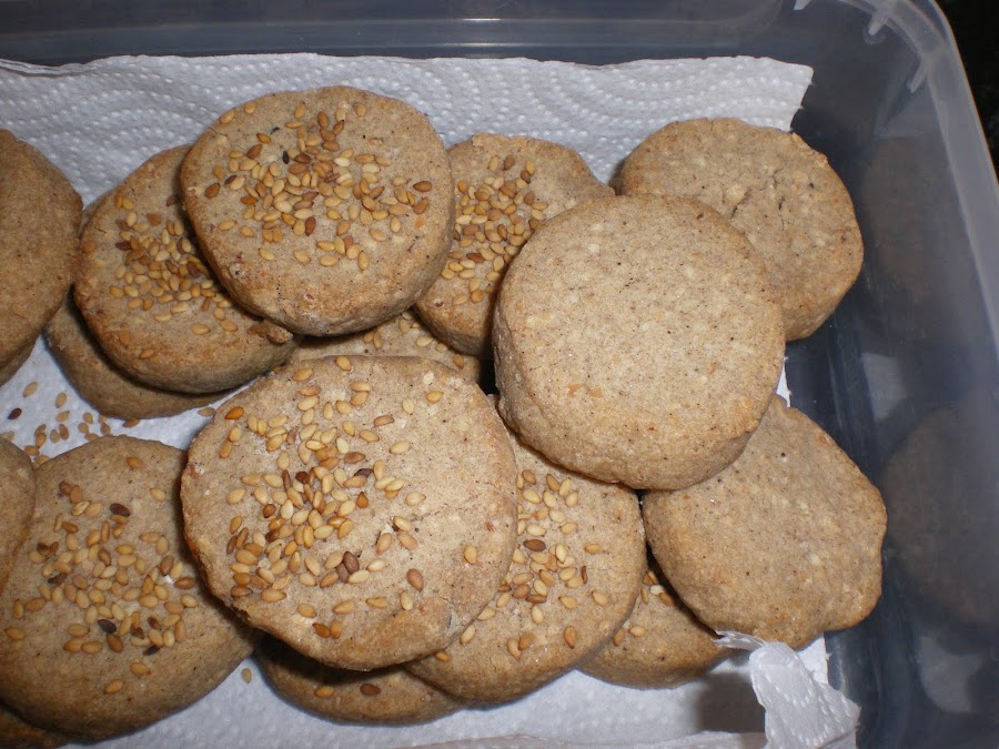 Tostar ligeramente la harina en una sartén, a fuego muy suave, y sin parar de remover. Dejar enfriar. Mezclar todos los ingredientes con las manos, hasta que se forme una pasta que se pueda manejar, y con la que podamos formar un rulo. Al principio cuesta, y parece arenosa, pero paciencia que a base de amasar se hace más manejable. Formar un rulo, y dejar enfriar en el frigo una media hora. Sacar y cortar porciones de unos 50 gr. a las que les acabaremos de dar forma con las manos. Espolvorear con ajónjoli y meter en el horno precalentado, a unos 200º durante unos 5-8 minutos. Dejar enfriar y servir!!