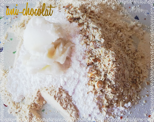 En primer lugar precalentamos el horno a 160ºC. En la bandeja del horno ponemos papel vegetal y echamos la harina (esto lo hacemos para quitarle la humedad y asi adquiera dureza). La tendremos unos 25 minutos, durante este tiempo, abriremos el horno de vez en cuando para para remover con una cuchara de palo, unas 3 o 4 veces. Echamos la harina sobre la mesa de trabajo y dejamos que enfríe un poco. Añadimos la manteca, el azúcar glass, y las almendras ya trituradas (puedes triturarlas en un mortero). Amasamos hasta tener una masa que no se nos pegue a las manos. Dividimos la masa. En la primera echamos coco al gusto (una cucharada sopera, depende de si te gusta o no) y en la segunda, lo mismo, al gusto, yo eché como 2 cucharadas de cacao o asi, hasta que vi que quedó morenita la masa. Amasamos lentamente y estiramos la masa entre dos papeles de film, dejamos las masas con un grosor de 1"5 cm (que queden gorditos). Al horno 160ºC precalentado. Los tendremos unos 15 minutos calor sólo arriba. Yo la bandeja la puse en el medio del horno. Pasado este tiempo, dejamos que enfríen en la misma bandeja (son delicados y si no se romperán) y preparamos otra bandeja con otra tanda y así hasta terminar. Por último, y si te apetece, espolvorea por encima el coco rallado.