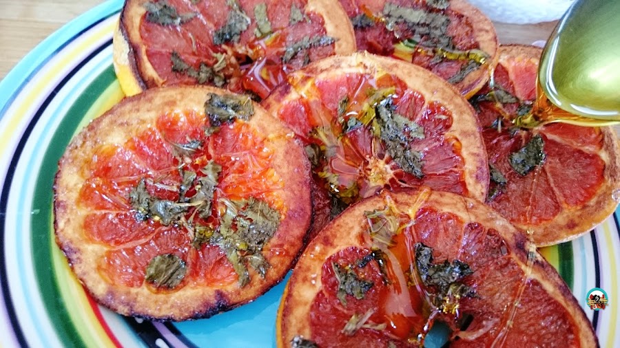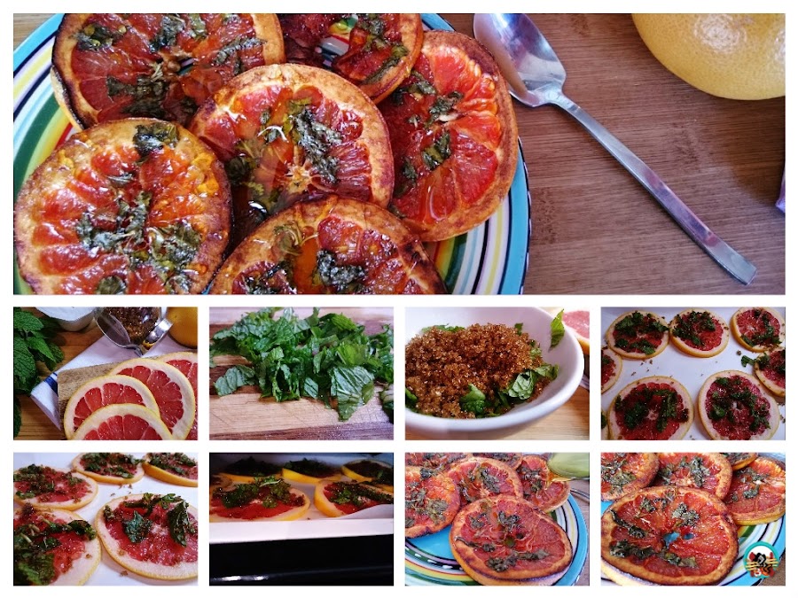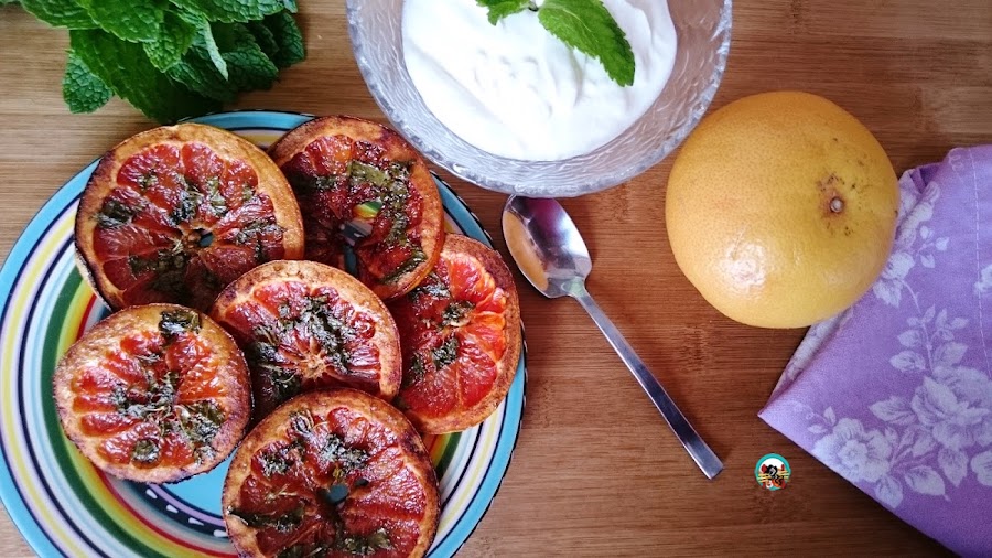 1.- Lavamos bien los pomelos rosa, los secamos con papel de cocina. Lo cortamos en rodajas finas, cubrimos una placa de horno con papel de horno. Dispersamos por encima la fruta cortada en rodajas. Picamos la hierbabuena y la mezclamos con el azúcar. Ponemos unas cucharadas de azúcar con hierbabuena sobre cada rodaja de pomelo. Los asamos 25 o 30 minutos con el horno precalentado a 180ºC. Retiramos del horno y servimos con miel y un cuenco de yogurt griego.