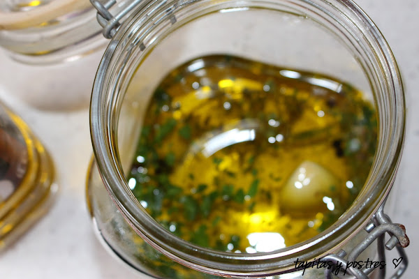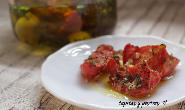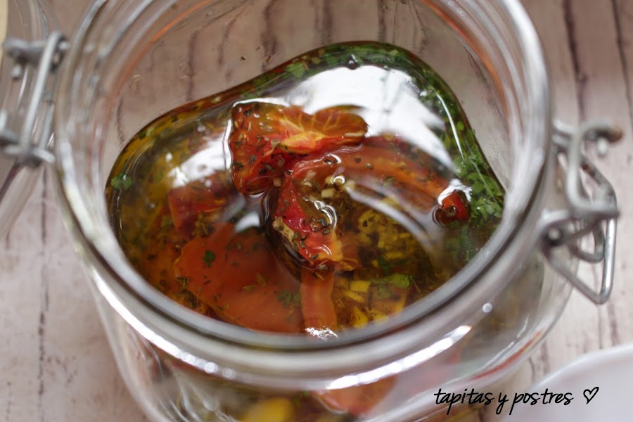 Esta receta es del Canal Cocina y me la pasó mi amiga Elena, que está siempre alerta a recetas que pueda poner en el blog y es un acierto porque es una receta sencilla y económica que una vez preparada se conserva en aceite lo que nos permite usarlo cuando lo necesitemos, como guarnición o acompañamiento paea carnes, tartas saladas, pizza... ya estoy pensando en qué los emplearé.