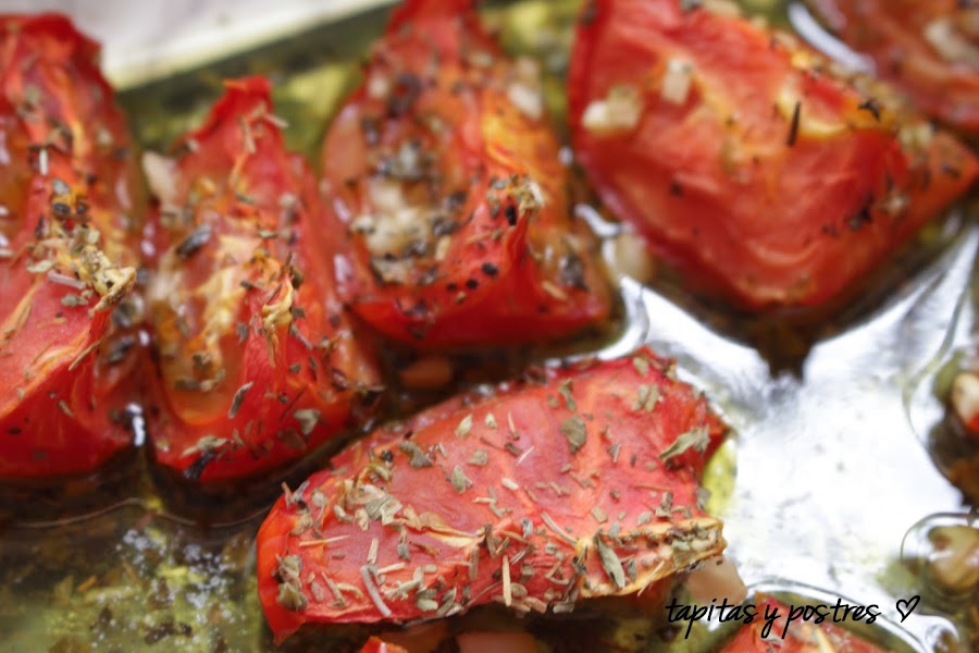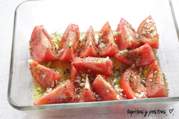 En una fuente de horno ponemos los tomates a gajos, Los sazonamos y le añadimos aceite de oliva, ajo picado y orégano. Los horneamos despacio a calor bajo.
