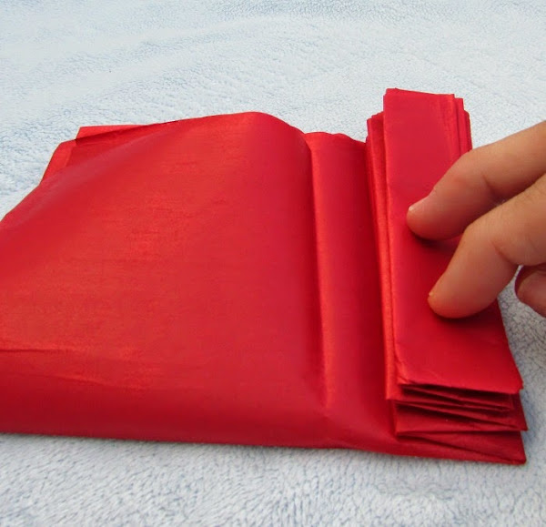 Doblamos las hojas de papel seda como un acordeón y las atas por el medio con la cinta