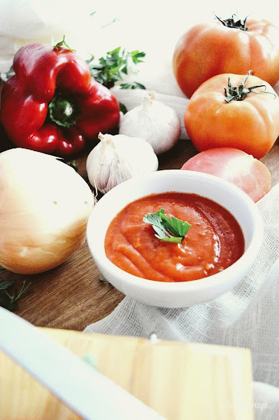 Entre las salsas más utilizadas quizá destaque la de TOMATE, con la que puedes acompañar todo tipo de pastas, arroces, carnes, pescados, huevos, patatas ... ¿quien no ha preparado alguna vez una rica salsa de tomate casera? La que yo preparo es muy simple: