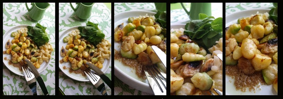 Amb una cullerada d"oli d"oliva dins una paella ceràmica anem cuinant els carabassons i els xampinyons, lentament. Els salpebram. Les paelles ceràmiques he trobat que són molt còmodes i que els aliment es cuinen sense substancies tòxiques com el politetrafluoroetileno.
