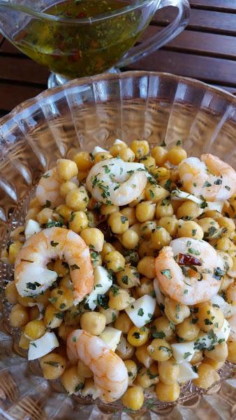En una sartén con aceite de oliva caliente, pasaremos a sellar los langostinos aunque no demasiado, Solo queremos que queden un poco más " a la plancha". Cuando los tengamos, añadimos a esta misma sartén los garbanzos y los huevos picados finamente y un poco más de cilantro. Removemos un par de minutos para que todos los sabores queden integrados.