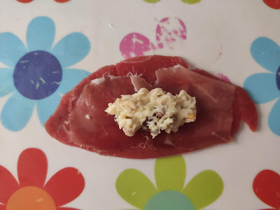 Por un lado vamos a hacer la pasta para el relleno. Quitamos la parte blanca del queso. Lo ponemos en en un cuenco. Lo partimos en trozos y lo batimos con un tenedor para que quede una especie de pasta. Añadimos las pasas y las nueces picadas en trozos muy pequeños.Salpimentamos los filetes, los cubrimos con una loncha de jamón y colocamos una cucharada de pasta.