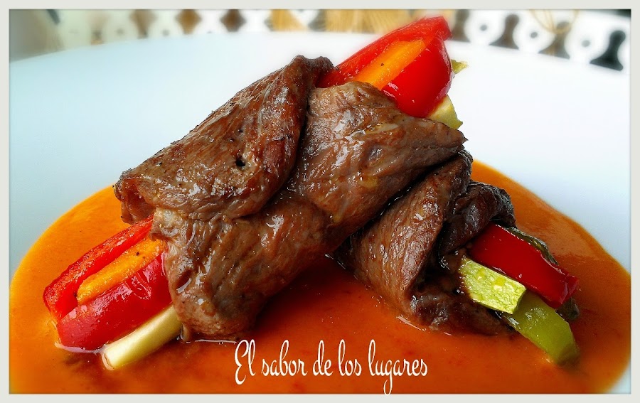 Salpimienta los filetes y rellena cada uno de ellos con un bastoncito de cada verdura. Enróllalos y sujétalos con un palillo de madera. Reserva.