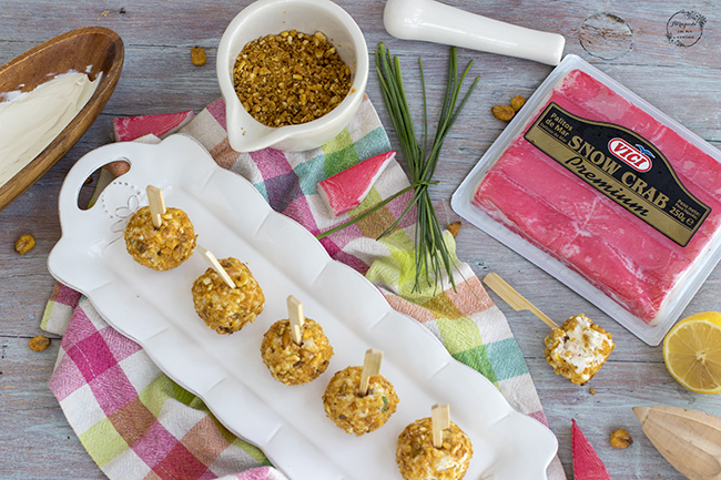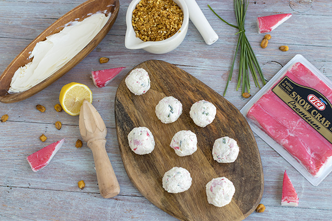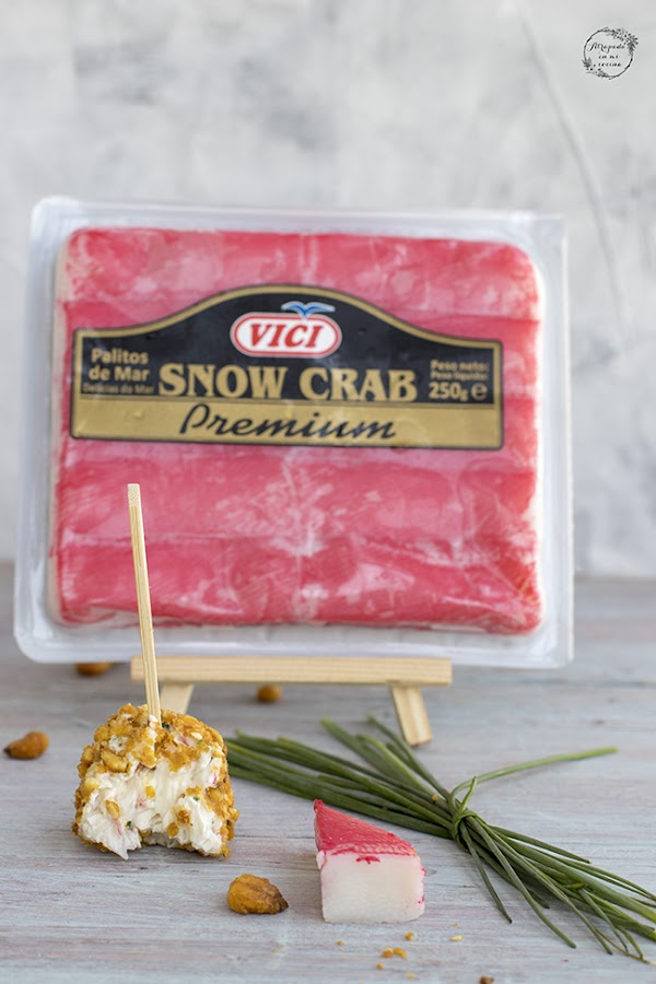 Ponemos en un bol el queso crema. Cortamos con un cuchillo los palitos de mar (Snow Crab), dejándolos bien picaditos y añadimos al bol. Picamos el cebollino e incorporamos a la mezcla anterior. Por último aderezamos con pimienta recién molida y un poco de zumo de limón. Removemos con la ayuda de un tenedor hasta que quede todo perfectamente integrado.