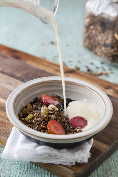 Ya he publicado varias recetas de granola en el blog, pero esta es la primera que preparo con cacao, queda de un color bastante oscuro y lo mejor es que cuando agregas la leche, el cacao ira manchándola hasta obtener un líquido marrón achocolatado que sabe a qué? pues a ¡chocolate! claro! y es realmente deliciosa.Granola de chocolate