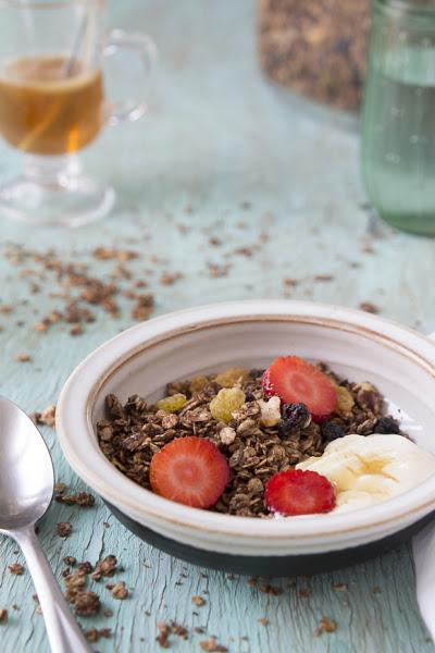 Pero después de haber pasado las últimas semanas comiendo donas, panes y postres de chocolate creo que bien vale la pena retornar a nuestro ritmo normal y desayunar algo mas saludable y a la vez rico como esta granola de chocolate y pasas que traigo hoy: