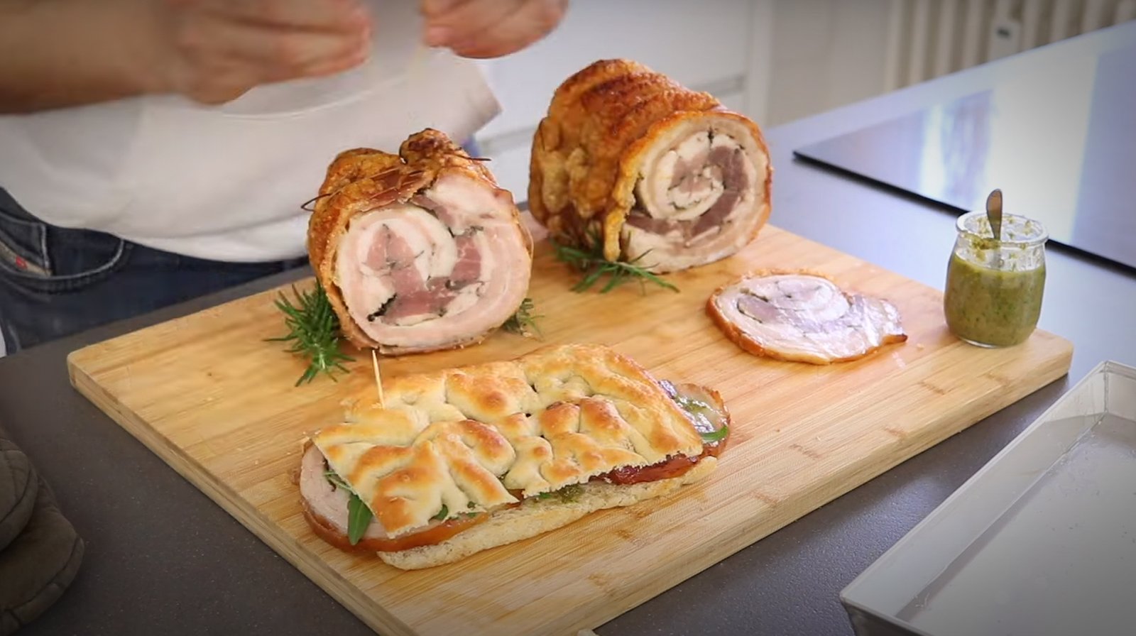 Aunque últimamente está de moda acompañar la pizza con porchetta, yo prefiero mil veces acompañar un sándwich de porchetta con focaccia y salsa verde toscana.La receta de la salsa toscana la encuentras al final del video de la porchetta.