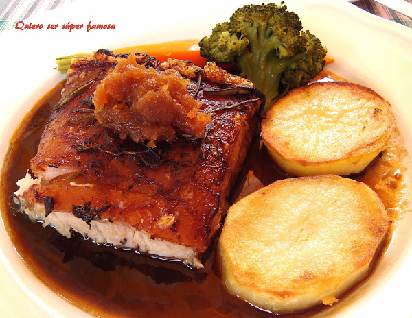 Justo antes de servir la carne, retirar el papel de aluminio (O el que le hayáis puesto). Encender el grill al máximo. Cuando esté caliente introducir la panceta hasta que veáis que se formen burbujas crujientes y doradas por encima de la piel. Tener mucho cuidado con este paso porque se tuesta en un momento y se os podría quemar.