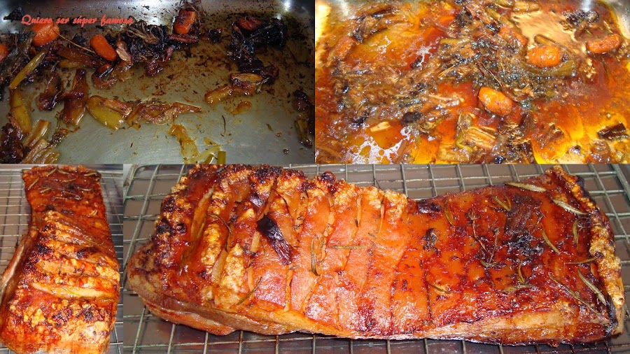 Retirar la panceta y colocarla en otra bandeja encima de una rejilla. Tapar bien con papel de aluminio y reservar en el horno apagado con la puerta abierta.