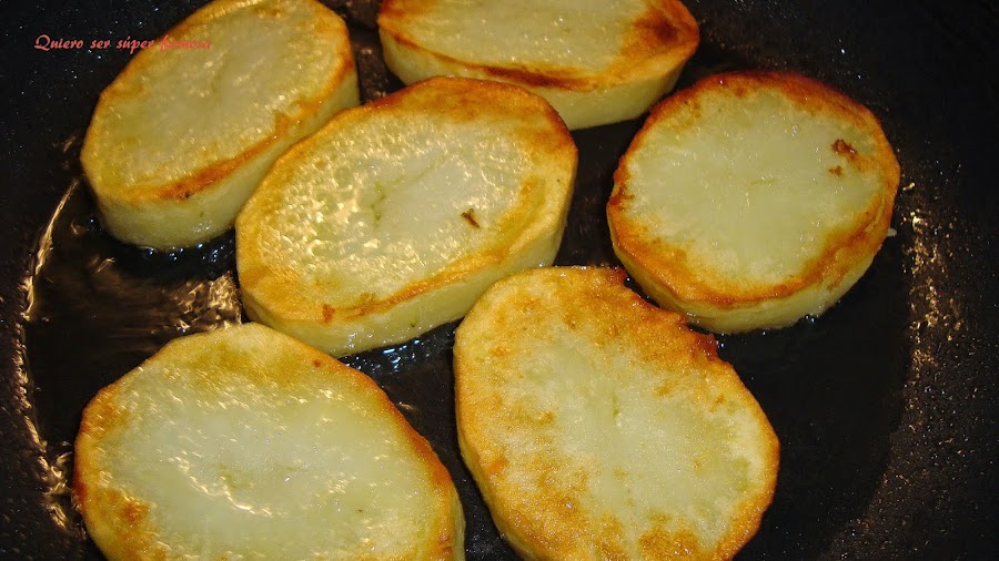 He cortado las patatas a rodajas gruesas. Después de cocinar al vapor las he dorado por los dos lados en una sartén con apenas un hilo de aceite de oliva.