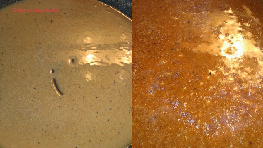 Añadir el jugo oscuro con toda las sustancia de las hortalizas a la sartén y mezclar. Preparar caldo caliente (No hirviendo que os saltará, ya digo que la mezcla no reacciona igual que cuando hacemos bechamel) y echar por encima poco a poco siempre removiendo con las varillas. Hervir para que reduzca y espese. Rectificar de sal si fuera necesario.