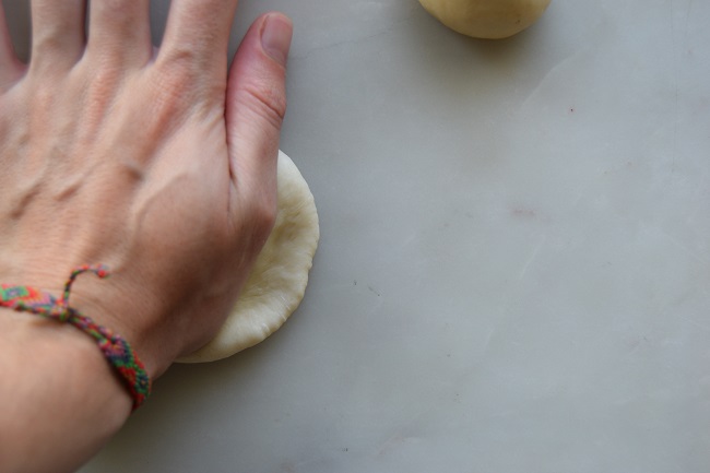 6. Una vez consigues tener 50 piezas cúbrelas con papel film para que no se sequen mientras trabajas. Después moldea cada una de ellas ayudándote con las palmas y los dedos de la mano, a mi me resulta más fácil hacerlo apoyando la masa sobre una superficie limpia y haciéndola girar sobre un eje imaginario impulsándola con el pulgar y la palma de la mano.