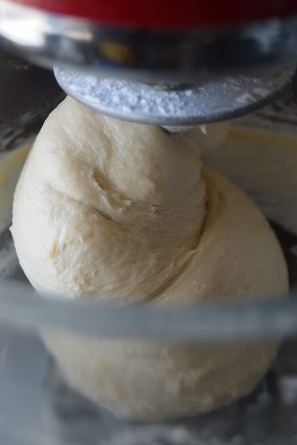 2. Añade la harina, el azúcar, la leche en polvo, la sal, la levadura química, el bicarbonato y la manteca de cerdo y comienza a mezclar a velocidad mínima durante 8 o 10 minutos. La masa debería formar una bola no demasiado pegajosa alrededor del gancho. (Si no tienes batidora puedes amasar a mano solamente tardará un poco más y será un poco más engorroso, procura integrar todos los ingredientes dentro del bol para no manchalo todo y una vez que tengas una masa más o menos homogénea continua amasando en una superficie de trabajo limpia y ligeramente enharinada. A la hora de amasar intenta seguir un método, pliega la masa sobre si misma y estira, pliega y estira hasta que la masa adquiera una textura más sedosa y casi no se pegue ni a las manos ni a la mesa)