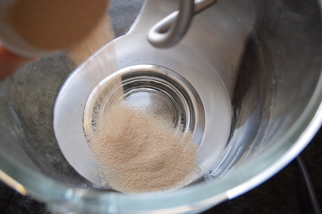 1. Mezcla el agua y la levadura de panadero en el bol de una batidora con gancho (o en su ausencia, en un bol grande).
