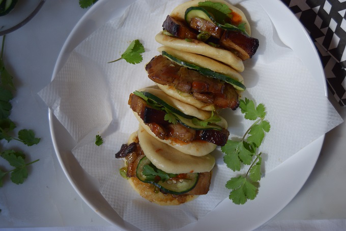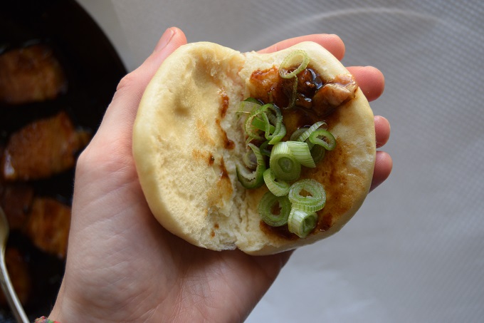 8- Et voilá! Ya está todo listo lo único que falta es montar el bocadillo al gusto. Se suele untar un poco de hoisin en uno o ambos lados del interior del pan y rellenarlo con trozos más bien gruesos de panceta, un poquito de cebolleta otro poquito de pepino, que aunque no te encante, aunque le tengas un poquito de paquete, te aconsejo que uses porque es el contrapunto perfecto de frescor que necesita una panceta concinada en su propia grasa, otro poquito de cilantro o perejil o nada, un poquito de sriracha y listo.