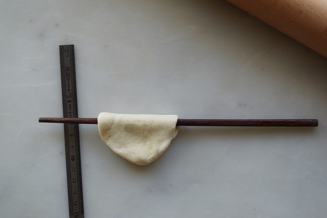 9. Aplasta cada bola primero con la palma de la mano y después con un rodillo pequeño (o grande si no tienes, o con el mismo rollo de plástico film si es que todavía no has tenido tiempo de conseguir un rodillo) de manera que consigas un ovalo de 10 cm de largo después coloca un palillo engrasada en medio y doblalo sobre sí mismo. Una vez doblado colócalo sobre una de las piezas de papel que has cortado y devuélvelo bajo el plástico film mientras te entretienes haciendo los 49 que te quedan.