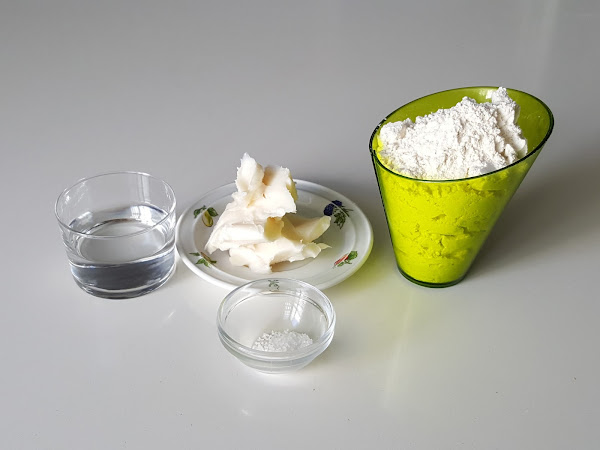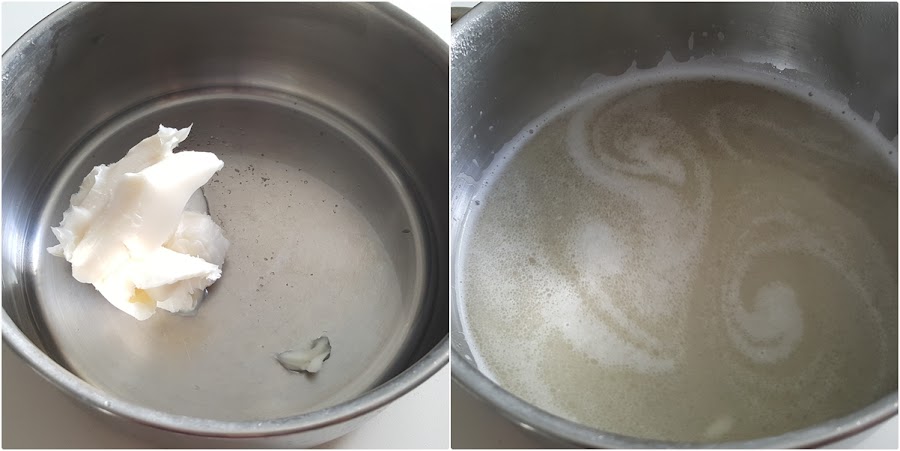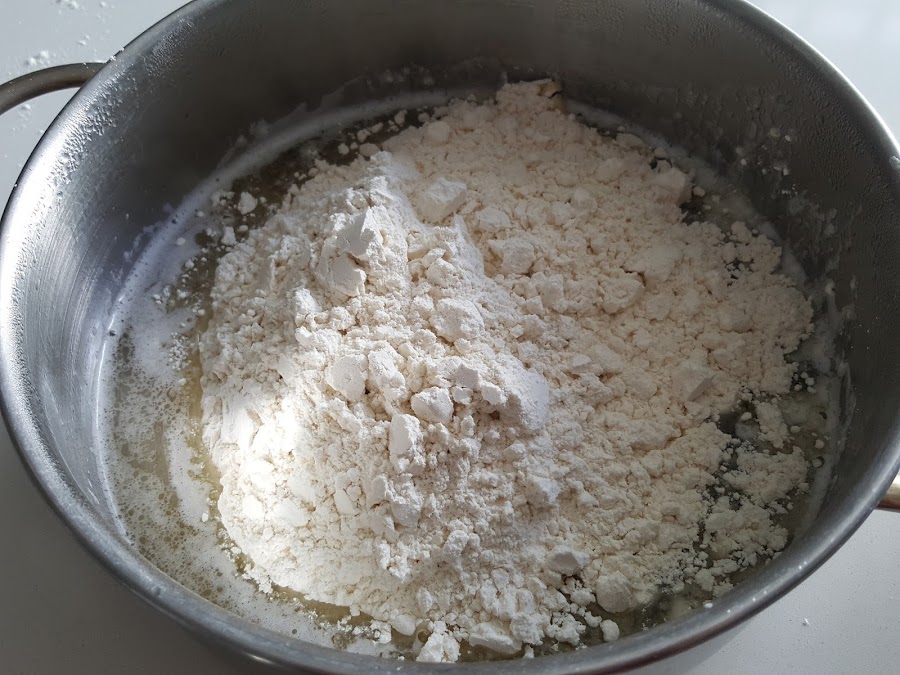 3. - En un cazo ponemos el agua a calentar junto con la manteca de cerdo, y cuando esté derretida, apartamos y agregamos toda la harina.
