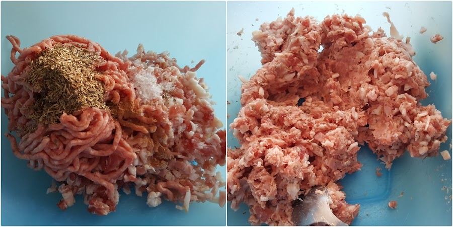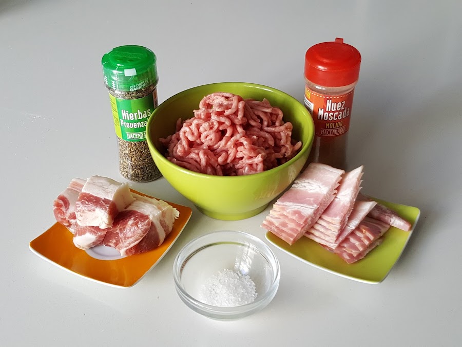2. - Ponemos en un bol la carne picada junto con la panceta, el bacon y las especias, SIN SAL, y lo mezclaremos todo muy bien. Y reservamos.