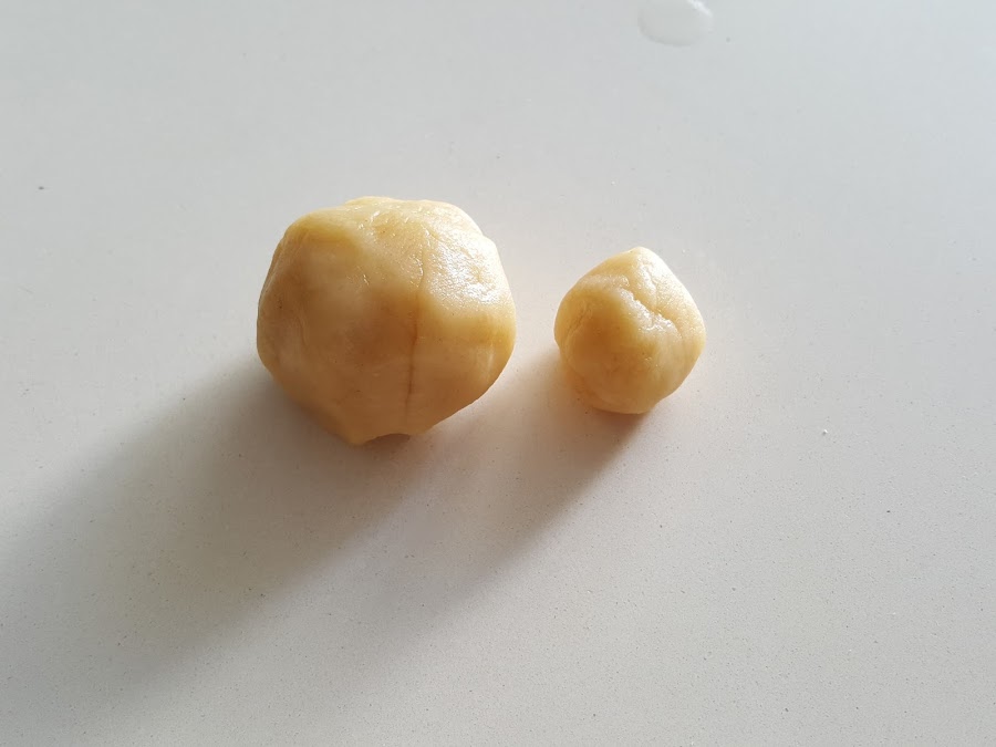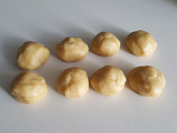 5. - Yo, como soy muy "tiquismiquis" he pesado la masa y he dividido entre 20, haciendo bolitas, para calcular mejor el resultado. Lo mismo he hecho con el relleno.